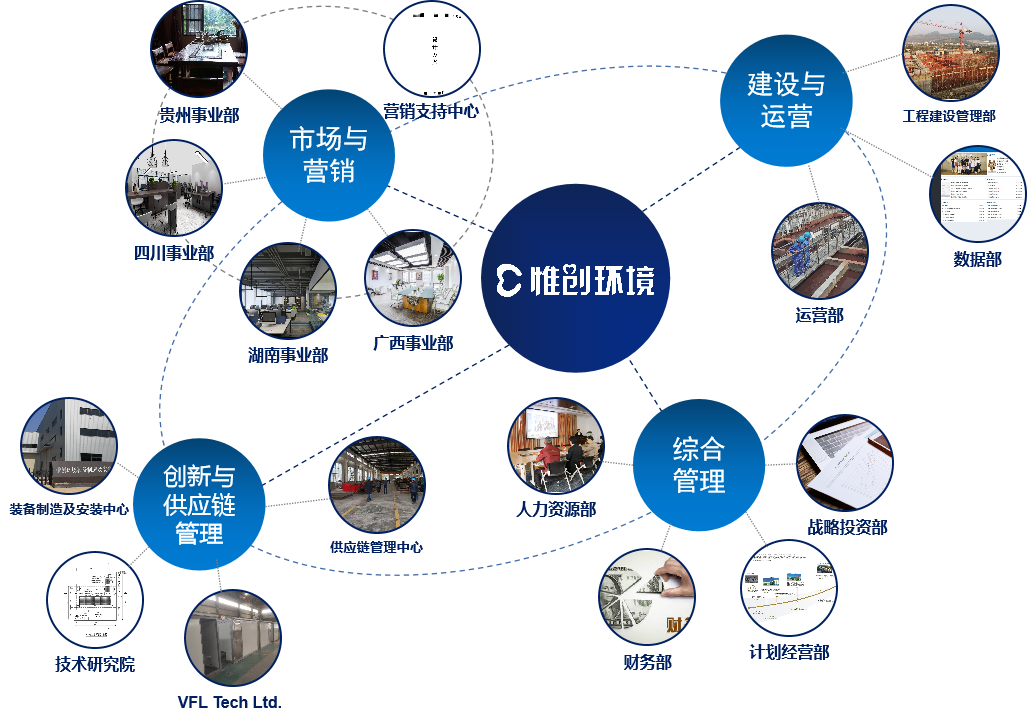 惟创环境集团现已形成了专业化的人才队伍和企业发展战略,设置有市场与营销、创新与供应链管理、建设与运营、综合管理四大业务职能体系,各体系下设职能部门,实现分管结合,精准匹配的管理目标,通过组织增长驱动业务增长。