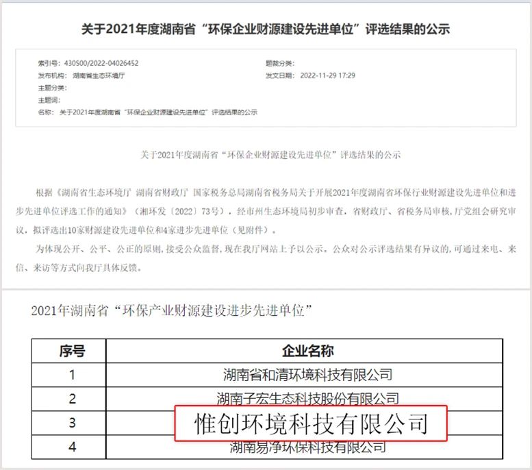 2023年2月10日,湖南省环境保护产业协会组织召开第六届第四次常务理事会(2022年度)。惟创环境应邀参加会议,并获评为2021年度湖南省“环保企业财源建设进步先进单位”。