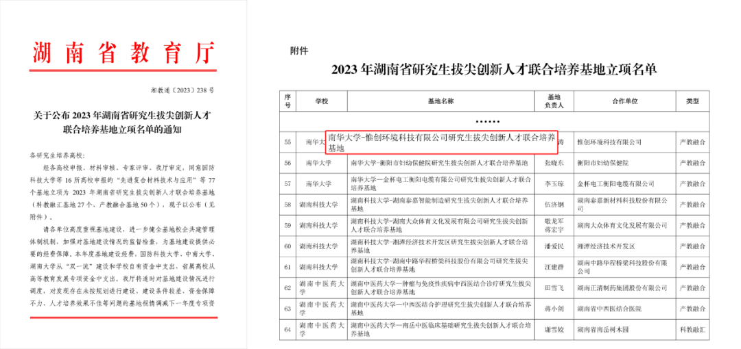 2023年8月3日,湖南省教育厅发布《关于公布2023年湖南省研究生拔尖创新人才联合培养基地立项名单的通知》,南华大学-惟创环境科技有限公司研究生拔尖创新人才联合培养基地正式立项。