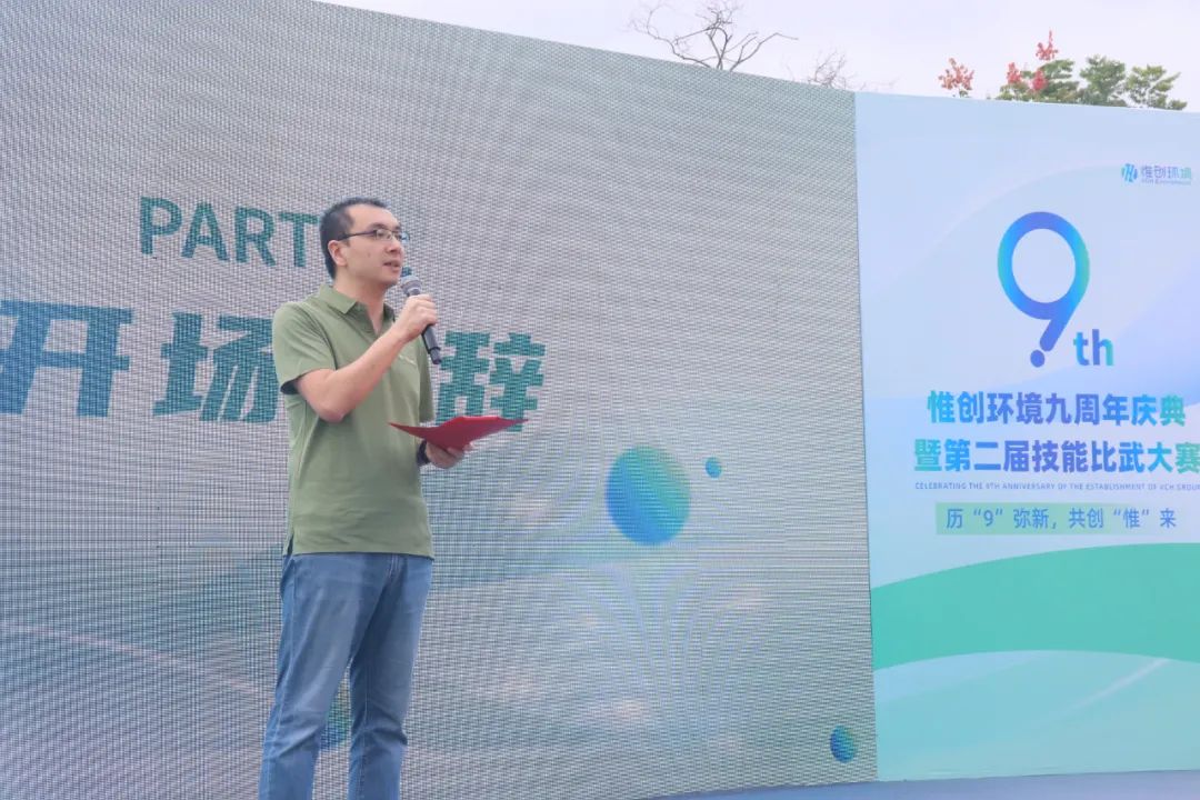 九周年庆典议程第一项,惟创环境首席产品官何国钢先生致开场辞。何总首先对于到场的同仁以及合作伙伴表示热烈欢迎与深切感谢,为我们讲述了公司恪守“诚信、分享、务实、创新”八字企业价值观,坚持“惟碧水,创未来”使命愿景的九年征途,同时展望公司未来的发展蓝图,并预祝第二届技能比武大赛圆满成功!