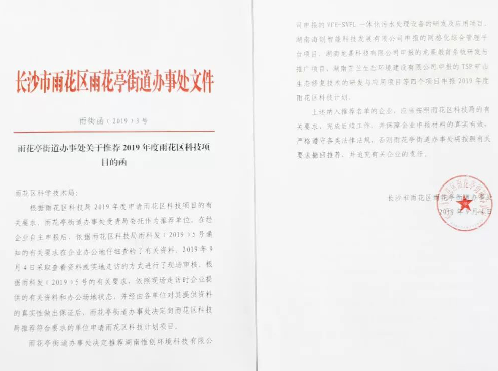 其中,湖南惟创环境科技有限公司申报的VCH-SVFL一体化污水处理设备的研发及应用项目被纳入推荐名单,标志着惟创环境申报雨花区科技项目的取得了阶段性的小成功。