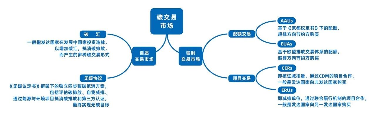 总体而言,国际碳市场可以简单地分为强制交易市场和自愿交易市场。