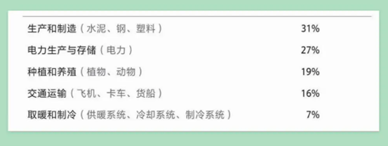 本书的第二大部分就对这五个方面进行了详细的阐述,这五个方面按温室气体排放量分别是:电力生产与存储(占27%)、生产和制造(占31%)、种植和养殖(占19%)、交通运输(16%)和制冷取暖(7%)。