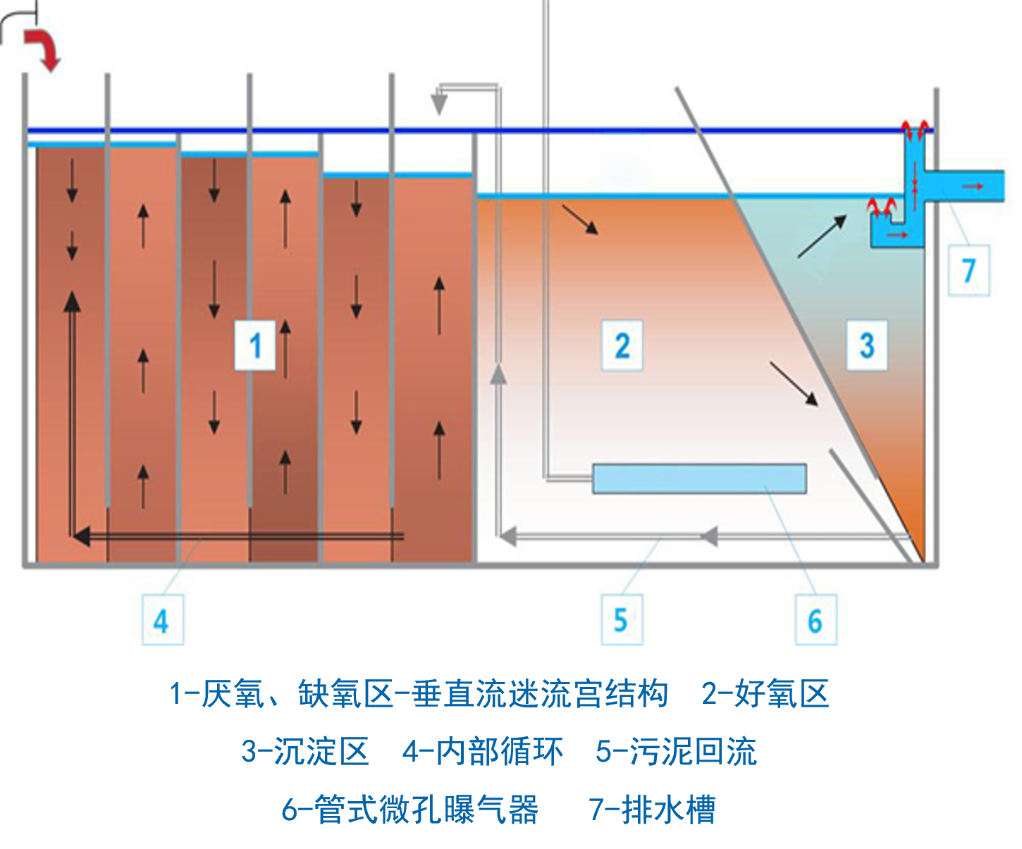 其次,厌缺氧区分隔成若干格,每一格都能形成较大高径比的反应室,使之具有很强的水力剪切力。以我们一个日处理规模为5000吨的项目为例,整个厌缺氧区分为80个反应室,每个反应室宽约2米,厌缺氧区有效水深(也就是高)约5.5米,因此,每个反应室的高径比均在2倍以上,形成强劲的水力剪切力,有利于颗粒污泥的大量形成。