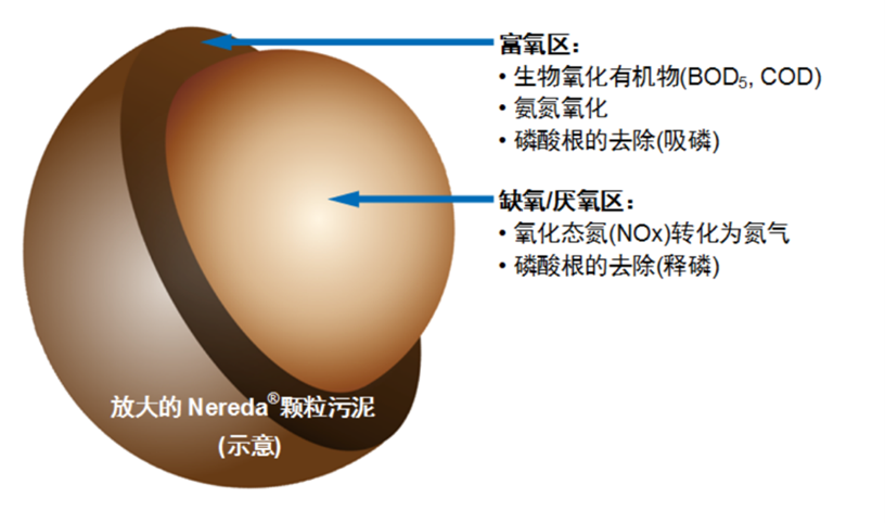 另外,我们来看一下荷兰DHV公司Nereda工艺的好氧颗粒污泥剖面示意图: