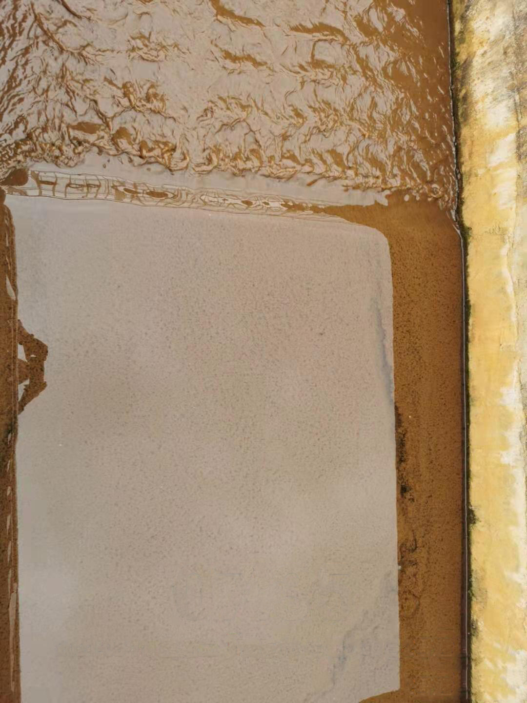放一张使用VFL技术的贵阳白云区牛场乡项目肉眼可见的颗粒污泥图片,阳光下可见其面上一层薄薄的清亮的上清液。