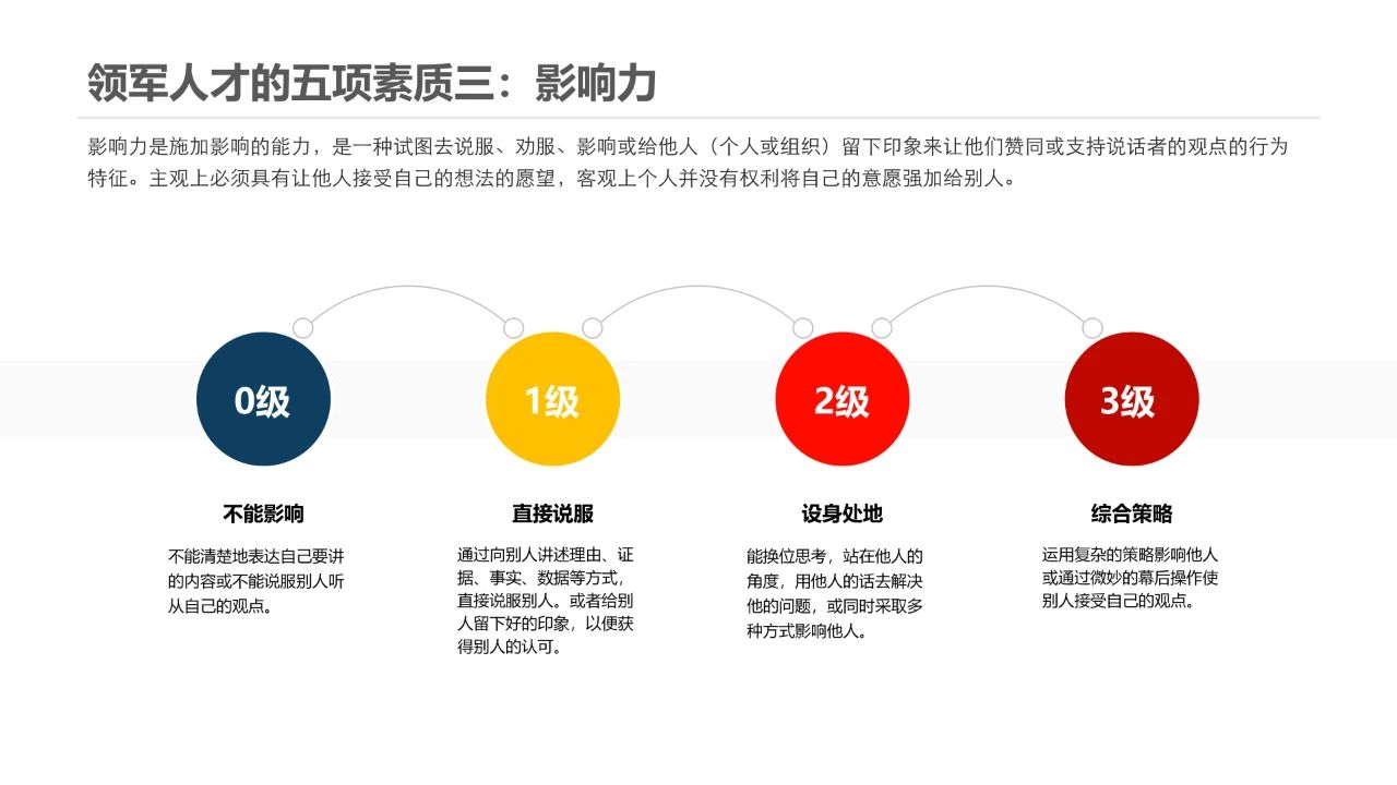 影响力能反映个人魅力。不是与人争论输赢,而是以对方所能接受的方式接纳你的想法。影响力的结果是获得认同,可以通过培养概念思维能力,掌握一定的策略,让他人信服。那么主动性也可以延伸为影响力,当一个团队拥有较强的主动性,那么这个积极主动的工作氛围会互相影响,这个场也会影响另一个场。