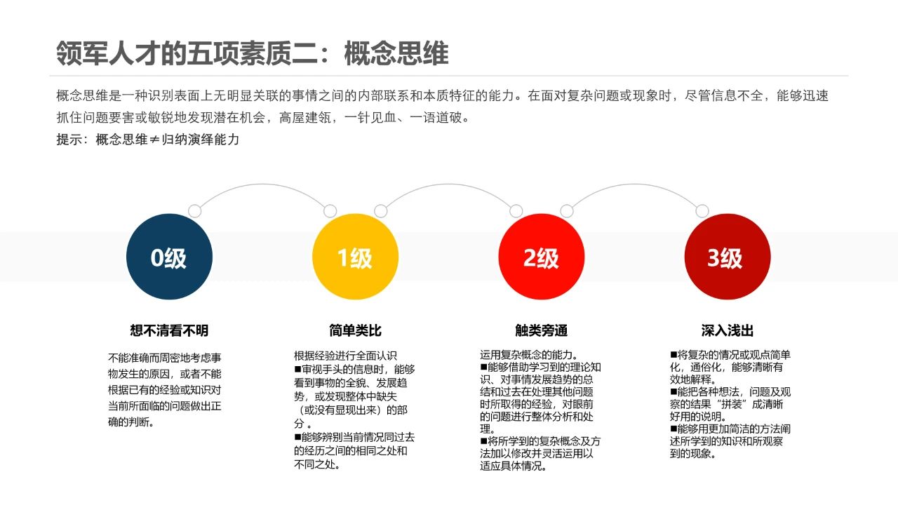 概念思维换言之就是思考方式,类似于高效能人士七个习惯中的“以终为始”。在处理事情的过程中是否有预判思路,是否会横向、纵向对比,是否会深层挖掘,找到要害,高屋建瓴,一语道破。各项目管理人员都要学会正确的思考方式,做到能从逻辑性思考中发现复杂事物背后真正的真相。