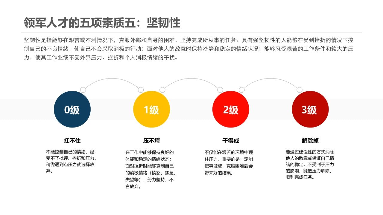 一个人需有坚韧的精神,扛得住生活和工作上的压力,有不言放弃的坚持和努力才能克服困难,有稳定的情绪,才能保持更积极的状态,更好的享受工作和生活。在工作之余我们也可以做一些有挑战性的事情来磨炼自己的意志,比如参加一定距离的长跑或者登山等比较考验意志的体育运动,坚持不断学习、阅读等,这些方式既可以锻炼身体,提高认知,也可以不断释放自身的压力,实现自我进阶。
